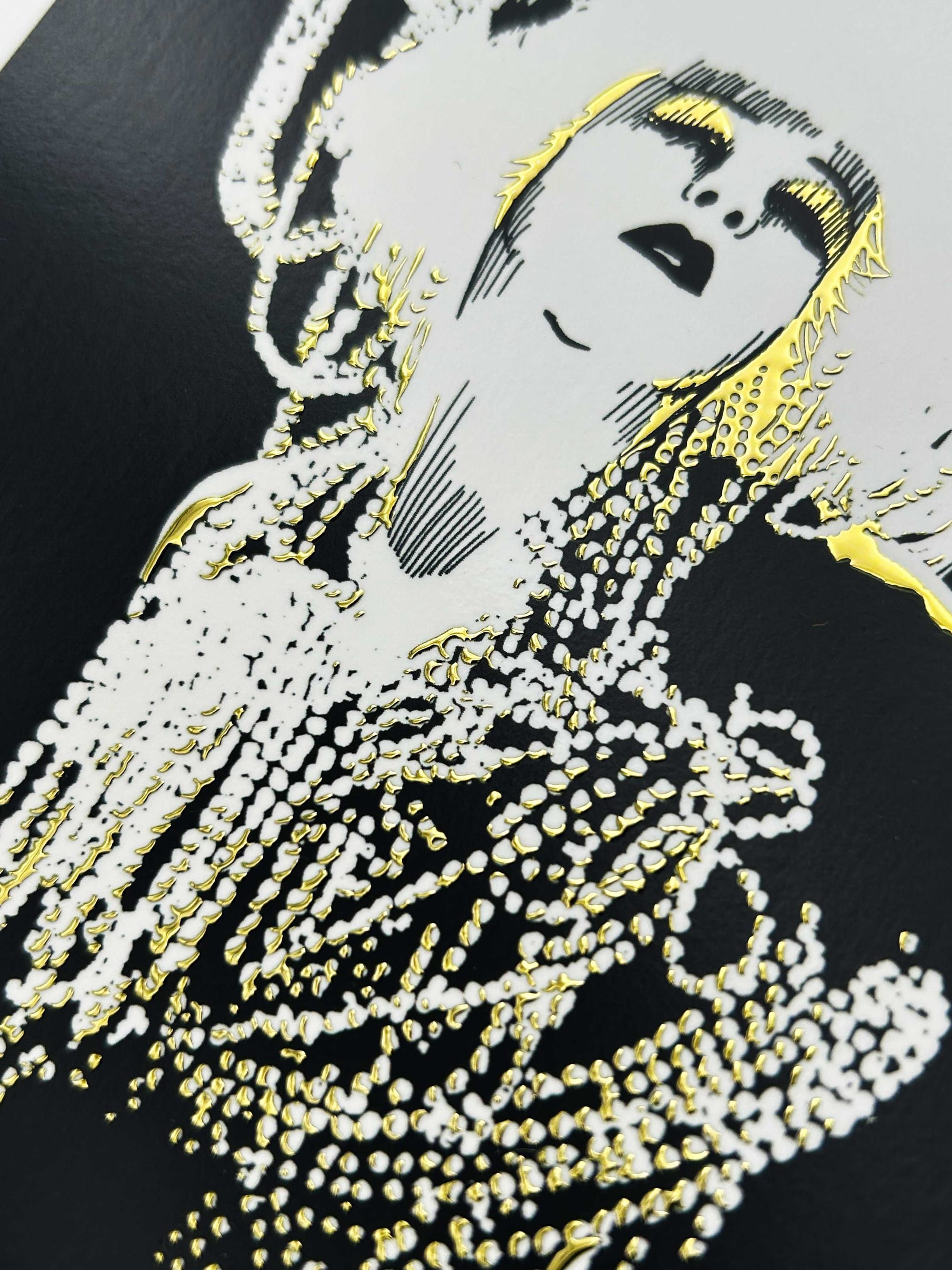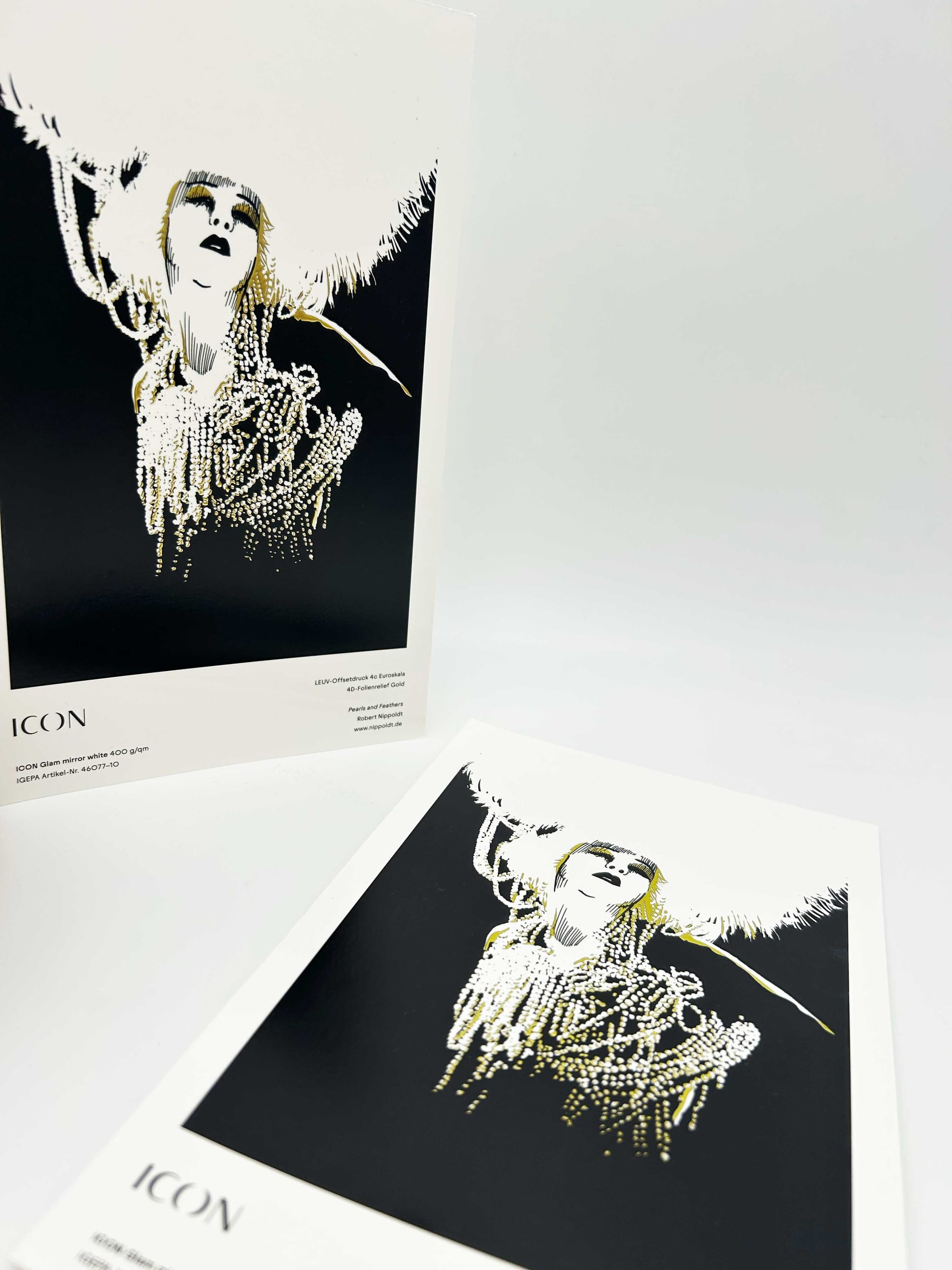 »Pearls & Feathers« von Robert Nippoldt wurde mit einem 4D Folienrelief in Gold auf ICON Glam mirror white veredelt.