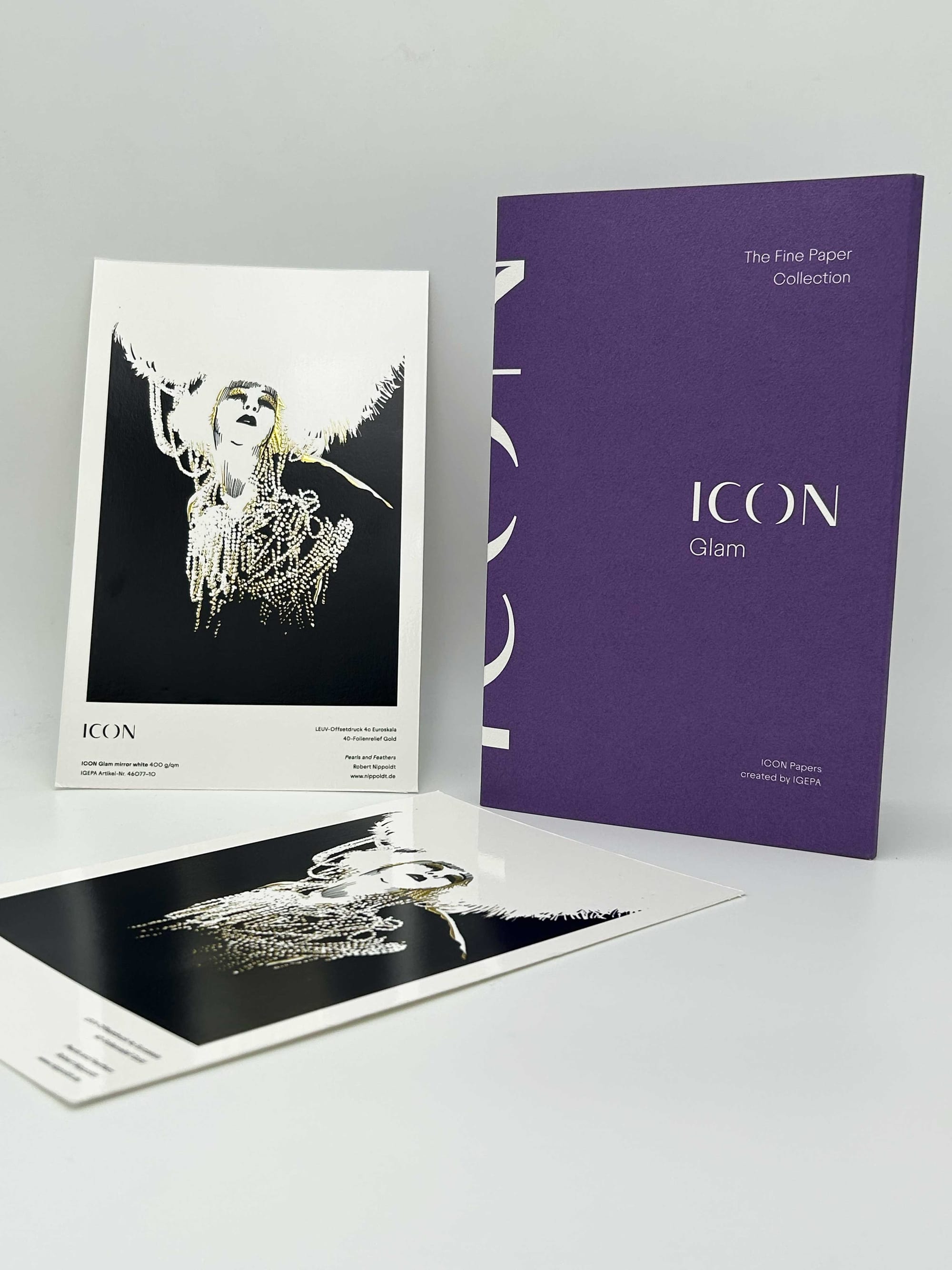 Eine stoffliche Textur, eleganter Glanz oder faszinierender Spiegeleffekt – jede Sorte von ICON Glam weist eine eigenständige Charakteristik auf und unterstreicht die Intention einer Marke oder aber eines künstlerischen Werks. Besonders deutlich wird dies anhand des neuen Musterbuches, das alle ICON Glam-Sorten übersichtlich dank eines Altarfalzes präsentiert. Darüber hinaus finden sich hier veredelte Druckbeispiele mit beeindruckenden Artworks, die das Potenzial von ICON Glam verdeutlichen.