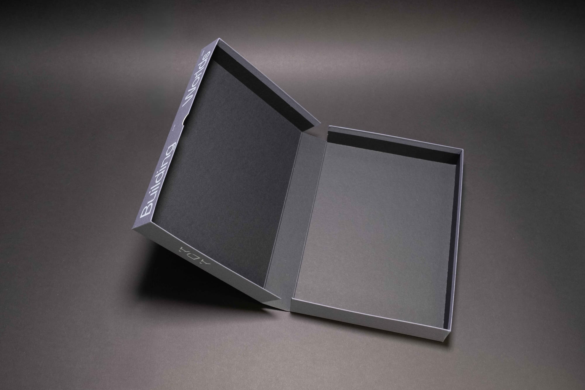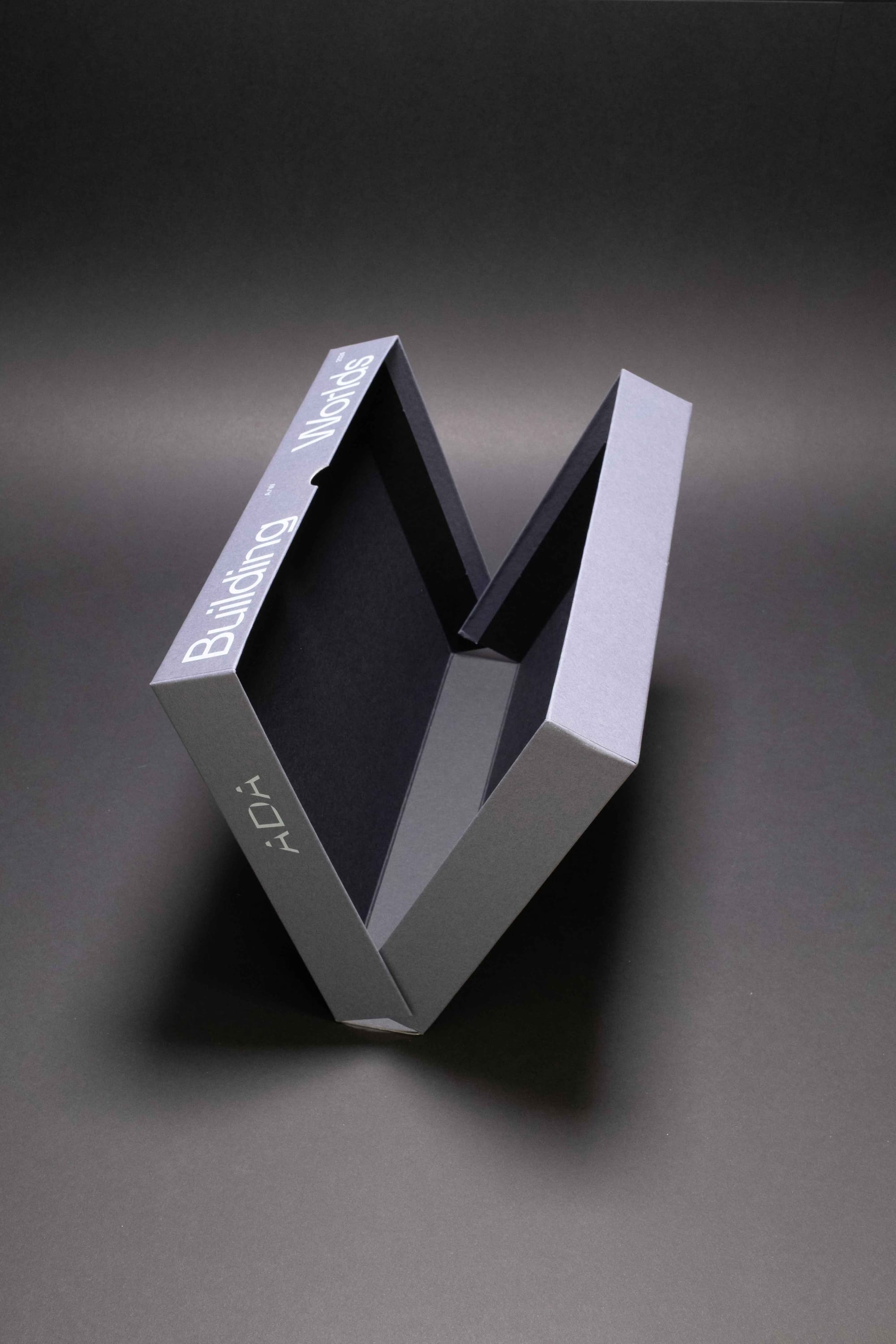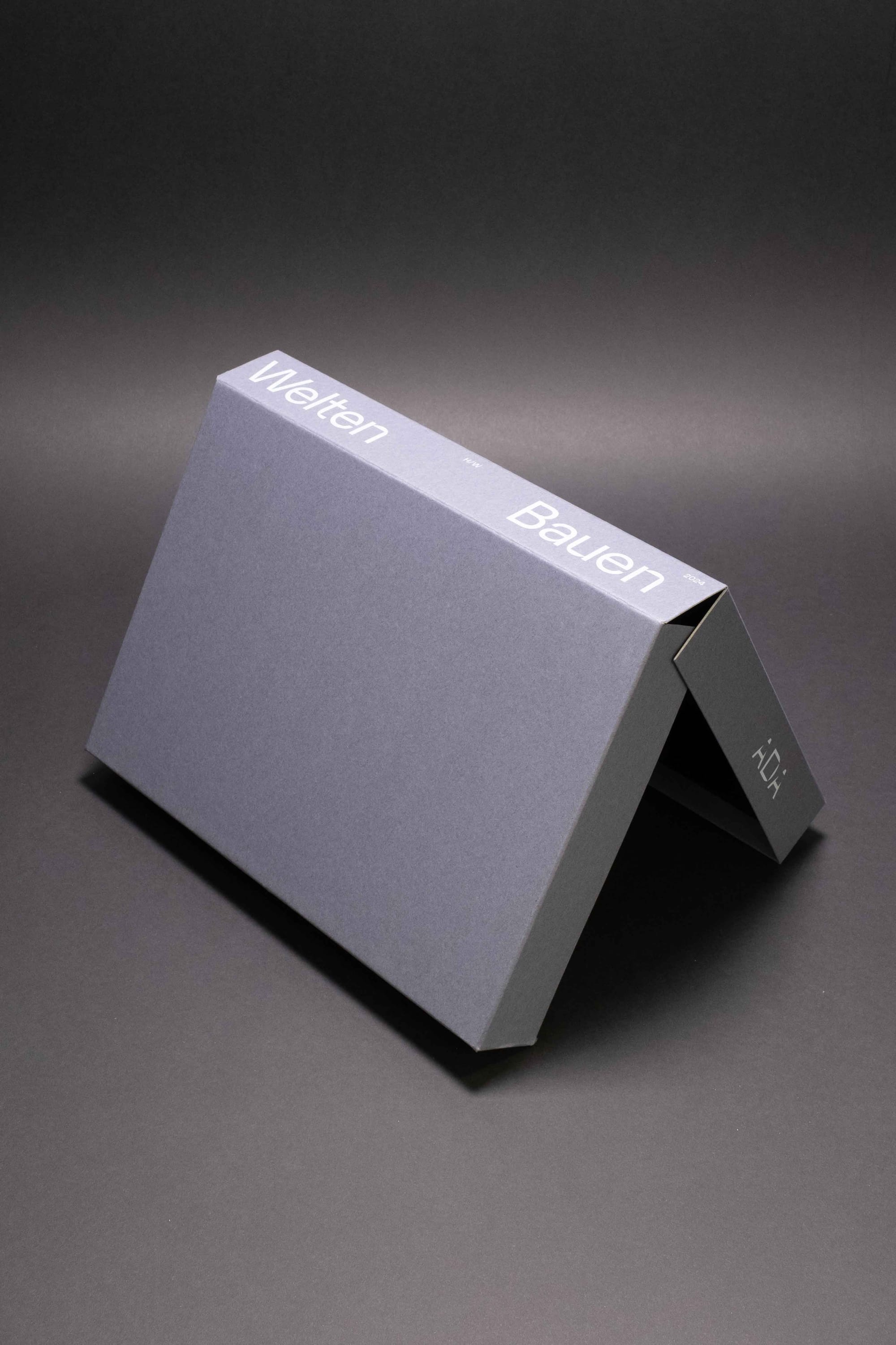 Als Teil der Ausstellung wurde eine hochwertige Box kreiert, die den charakteristischen Archivkartons nachempfunden wurde: Verwahrt das ADA doch seine rund 1,5 Millionen Objekte in tausenden solcher Exemplare. Für die besondere Edition, die mit Publikationen zur Ausstellung »Welten bauen« bestückt wurde, durfte ICON Nature rough pale blue grey (120 g/qm) seinen ganzen Charme ausspielen. Einfarbig bedruckt (Schröerlücke) und mit reduzierter Typografie versehen, vereint das Objekt den historischen Bezug mit moderner Ästhetik.
