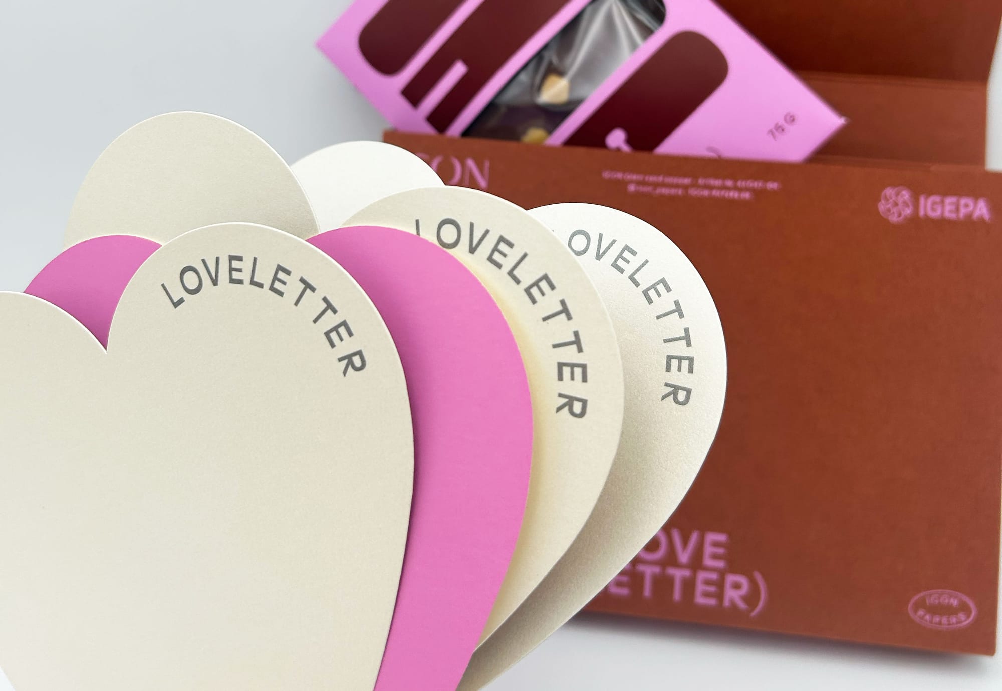 So entstand mit dem IGEPA Loveletter nicht nur ein praktisches Kommunikationstool: Die Kombination unterschiedlicher ICON Glam-Sorten wird zu einem multisensorischen Unboxing-Erlebnis und zeigt damit, wie Designpapiere für Emotionen im Branding sorgen können. Schließlich lebt eine hochwertige Produktinszenierung von haptischer und visueller Eigenständigkeit, die ein wirkungsvolles Packagingdesign mit sich bringt.