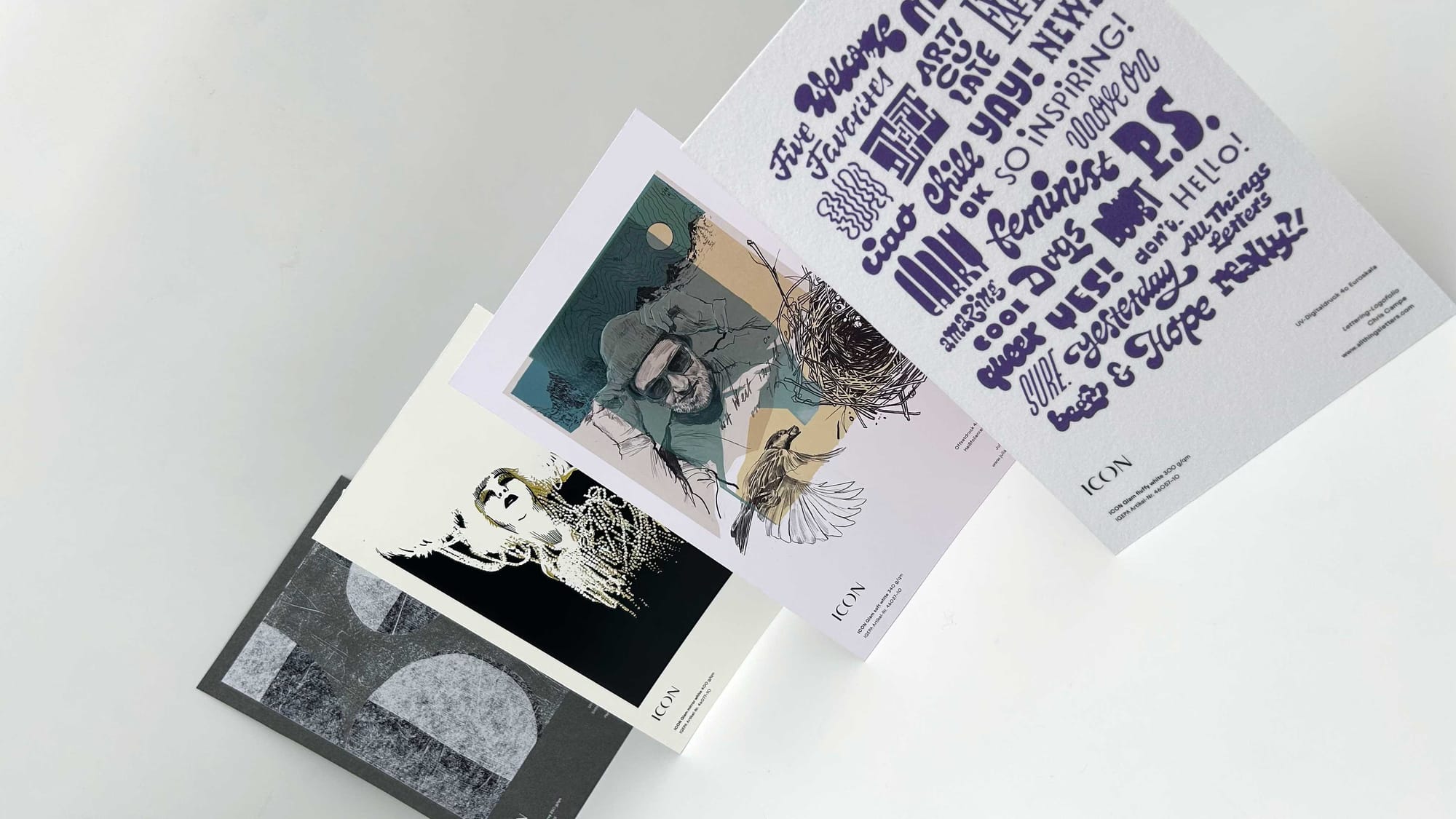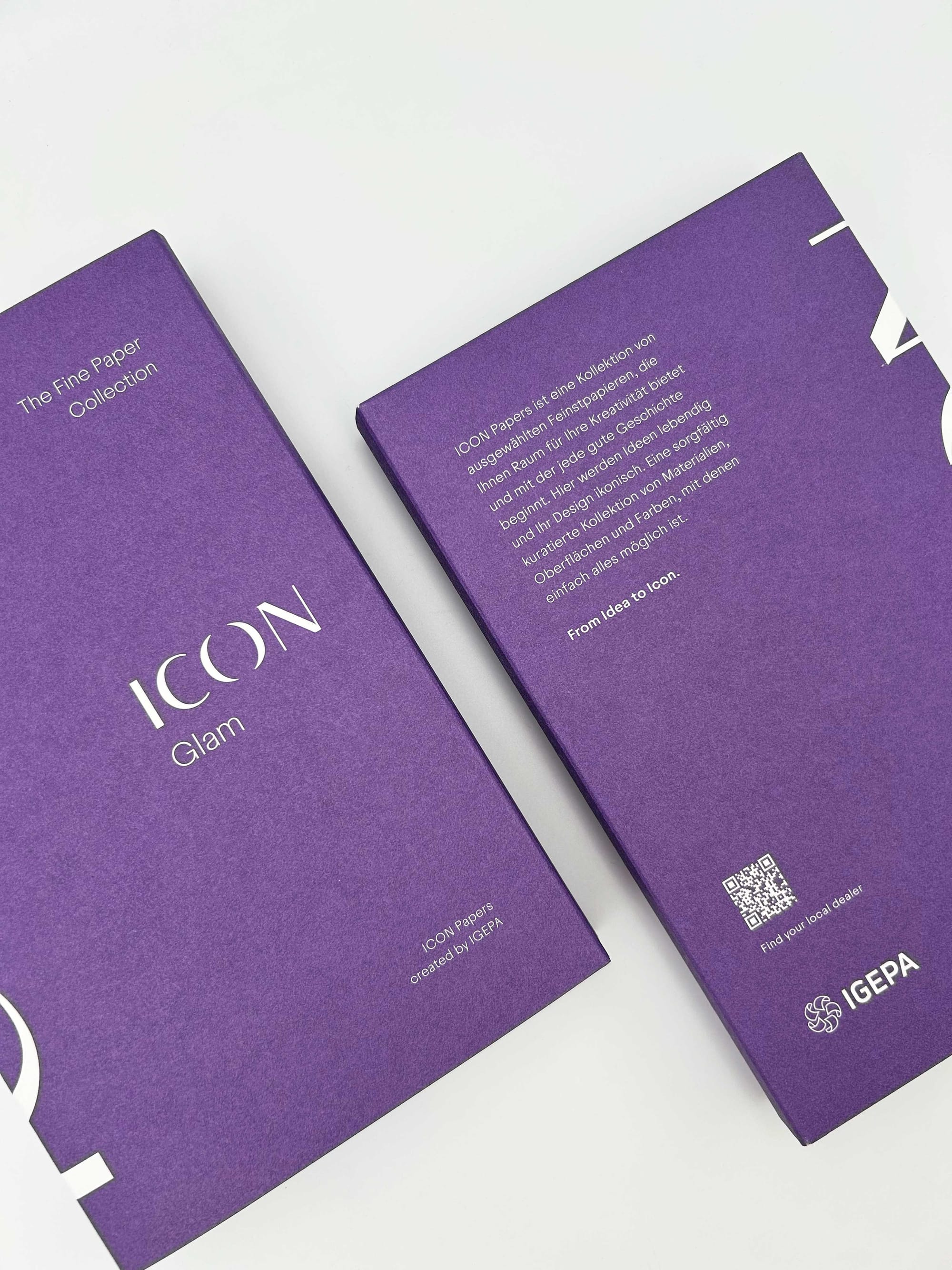 Gewohnt übersichtlich lassen sich auch in dem neuen ICON Glam-Musterbuch alle Sorten auf einen Blick entdecken: In farblicher Abstufung sowie mit stringenter Sortenbezeichnung präsentiert der vierteilige Altarfalz alle verfügbaren Sorten. Zudem wurden vier Kreative sowie Veredelungsunternehmen eingeladen, Inspirationen für die Anwendung zu realisieren. So zeigen wir unter anderem, wie brillant die Farben auf ICON Glam sand dark grey mittels UV-Digitaldruck und einer Weißunterdruckung im Siebdruck stehen. Die flauschige Oberfläche von ICON Glam fluffy wurde ebenfalls im UV-Digitaldruck exzellent verarbeitet. Eine edle Heißfolienprägung lässt wiederum ICON Glam soft white strahlen und das spiegelglatte ICON Glam mirror white weist ein elegantes 4D-Folienrelief in Gold auf. From Idea to ICON, from ICON to Idea – unser Leitmotiv findet mit ICON Glam eine expressive Fortführung.