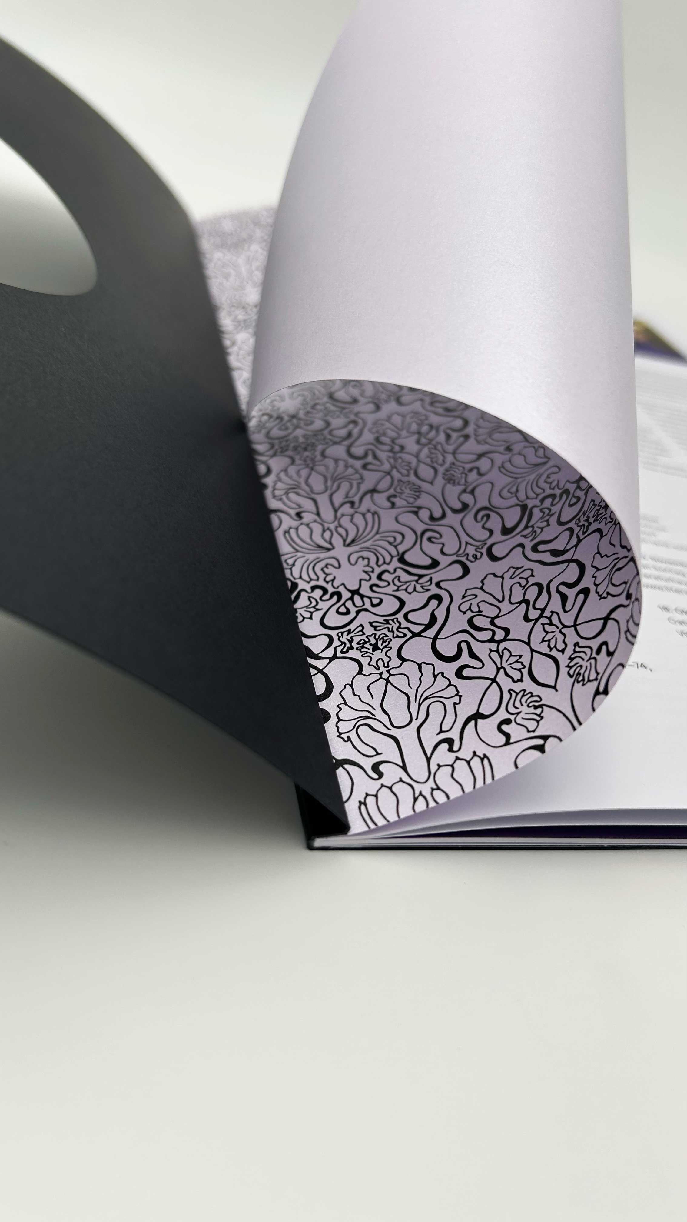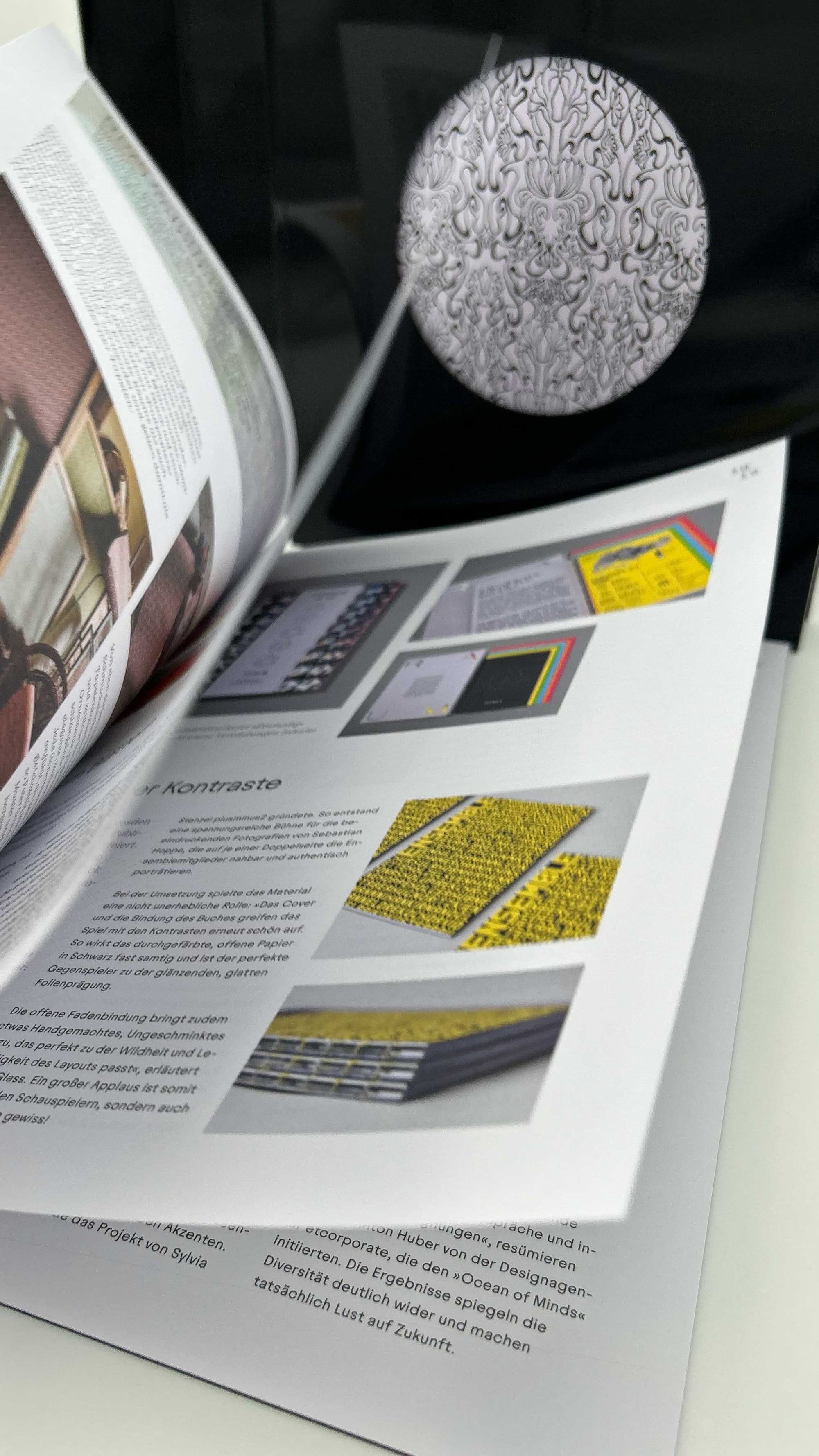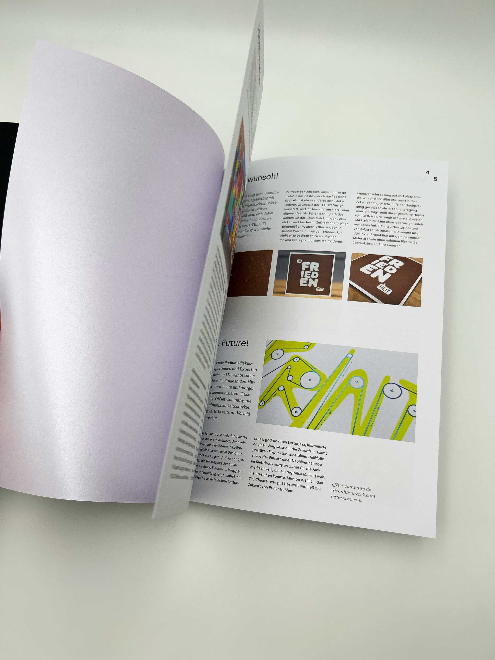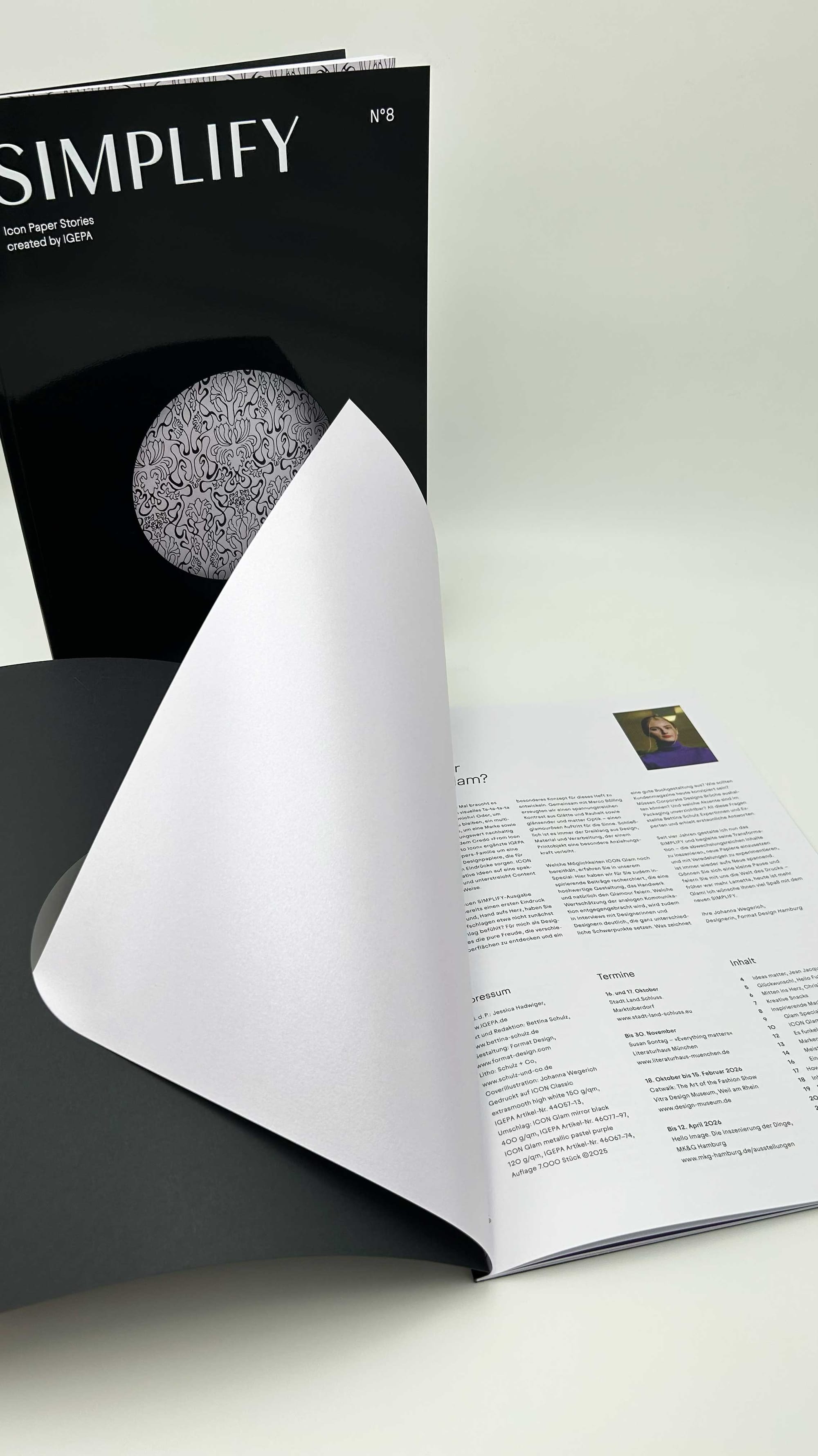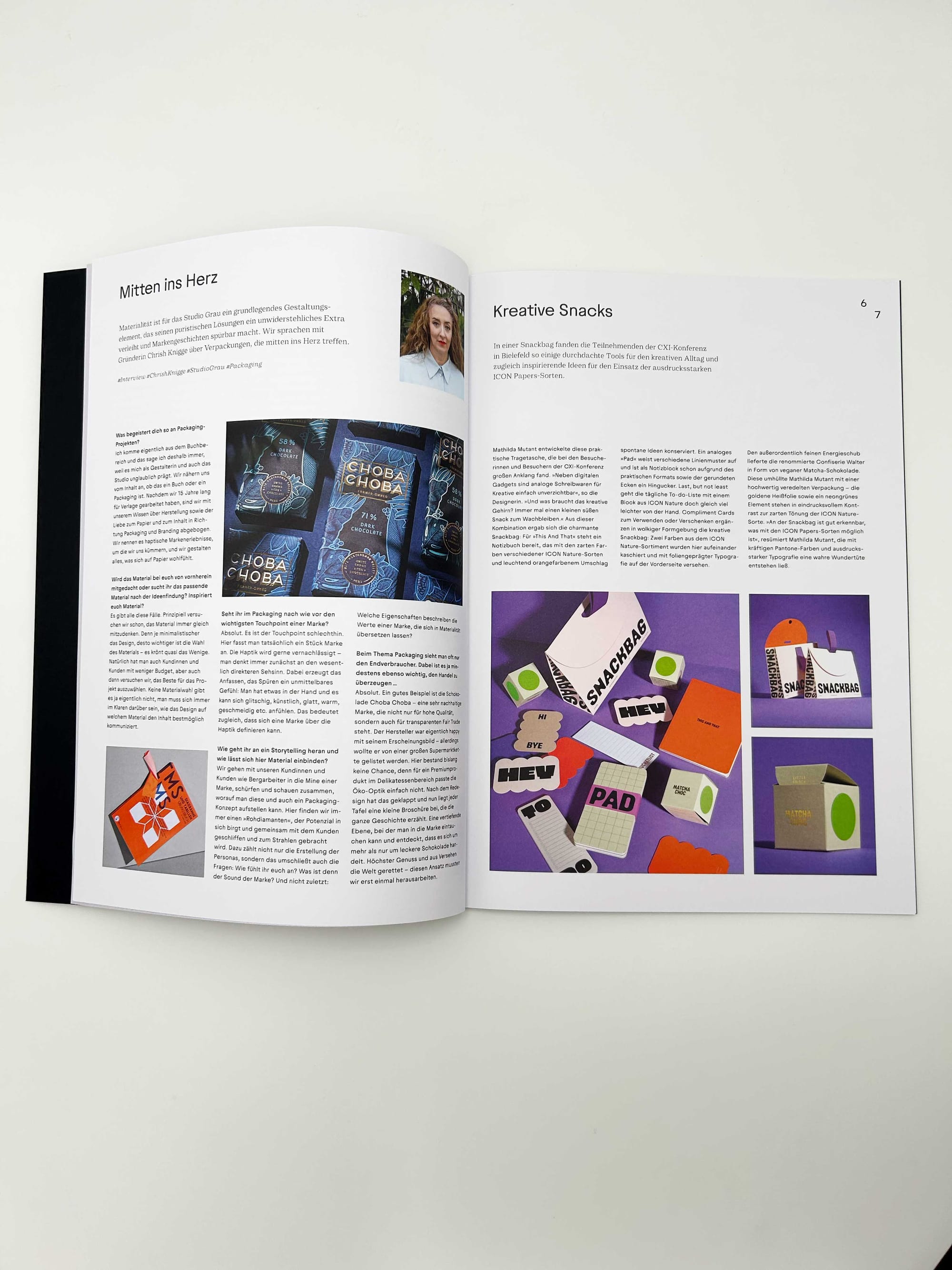 Aus diesem Grund haben wir uns für ein Doppelcover entschieden, das mit einem reizvollen Kontrast aufwartet: ICON Glam mirror black wurde mit Heißfolie veredelt und gewährt mittels einer Stanzung einen Blick auf das dahinterliegende ICON Glam metallic pastel purple. Zwei unterschiedliche Oberflächen treffen hier aufeinander und bescheren sowohl visuell als auch haptisch ein intensives Erlebnis. Im Innenteil setzten wir ICON Classic extrasmooth high white ein, das die kreativen Projekte in dieser Ausgabe mit einem brillanten Druckbild würdigt.